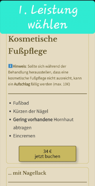 ℹ️Hinweis: Sollte sich während der Behandlung herausstellen, dass eine kosmetische Fußpflege nicht ausreicht, kann ein Aufschlag fällig werden (max. 10€)